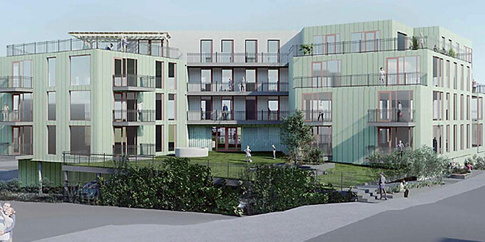 Hugmyndir eru um að nýtt þriggja til fimm hæða hús með verslun og þjónustu á götuhæð og allt að 48 íbúðum á efri hæðum muni...